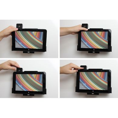 Държачът е много здрав, телефонът не се залепва в него и не вибрира. Държачът има панта, благодарение на която можете лесно да завъртите телефона в хоризонтално или вертикално положение или да го наклоните по всяко време. Скобата се прикрепя към ProClip на Brodit.