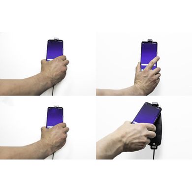 Държачът е много здрав, телефонът не се залепва в него и не вибрира. Държачът има панта, благодарение на която можете лесно да завъртите телефона в хоризонтално или вертикално положение или да го наклоните по всяко време. Скобата се прикрепя към ProClip на Brodit.