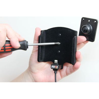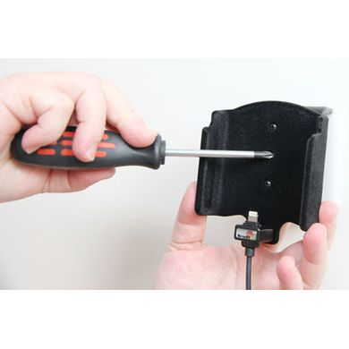 Държачът е много здрав, телефонът не се залепва в него и не вибрира. Държачът има панта, благодарение на която можете лесно да завъртите телефона в хоризонтално или вертикално положение или да го наклоните по всяко време. Скобата се прикрепя към ProClip на Brodit.