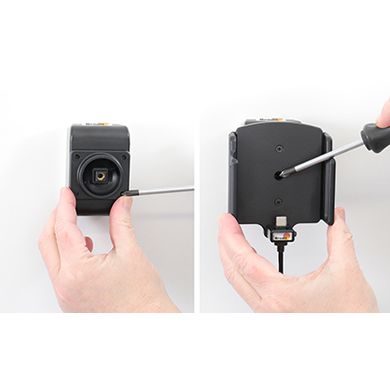 Държачът е много здрав, телефонът не се залепва в него и не вибрира. Държачът има панта, благодарение на която можете лесно да завъртите телефона в хоризонтално или вертикално положение или да го наклоните по всяко време. Скобата се прикрепя към ProClip на Brodit.