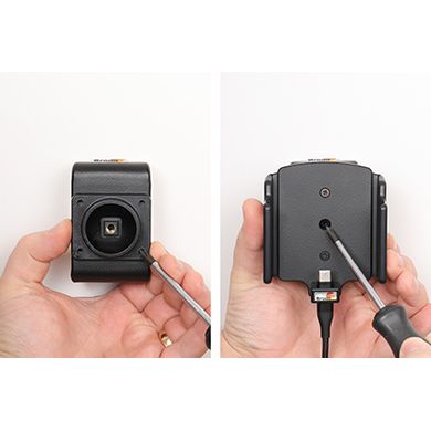 Държачът е много здрав, телефонът не се залепва в него и не вибрира. Държачът има панта, благодарение на която можете лесно да завъртите телефона в хоризонтално или вертикално положение или да го наклоните по всяко време. Държачът е прикрепен към ProClip Brodit.