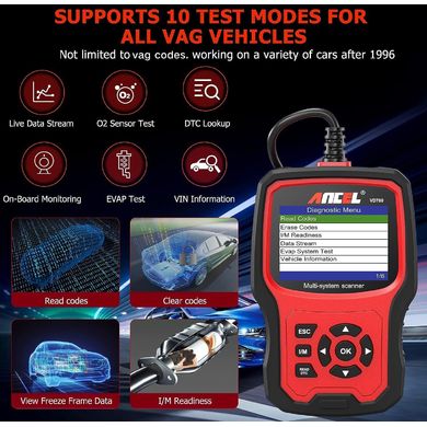 ANCEL VD700 има 2,8-инчов дисплей и графичен интерфейс в две цветови схеми. Резултатите от тестовете могат да се показват на 11 езика, включително на български. Управлението е интуитивно и лесно. За превозни средства, поддържащи OBD2, VD700 предлага 6 стандартни диагностични режима. Той ви позволява да четете и изтривате кодове за неизправности, да преглеждате дефинициите на кодове, да изключвате лампата за проверка на двигателя, да четете потоци от данни, да тествате системата EVAP, да четете готовността за I/M и да получавате информация за VIN. Автоматичното разпознаване на модела на автомобила го прави лесен за използване. Инструментът е подходящ както за обикновени потребители, така и за професионални автосервизи. С размери 125×70×22 мм и тегло 470 грама, той е компактен и лесен за пренасяне.