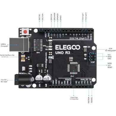 Контролната платка UNO R3 на Elegoo е основен елемент за въвеждане в програмирането на електроника. Платката е 100% съвместима с официалната среда за разработка на Arduino и софтуера за програмиране ElegooKit и може да се захранва чрез USB и външно захранване. Подобно на Arduino UNO R3, платката е оборудвана с чипове CH340C и SMD ATmega328p, които гарантират повече памет и по-високи скорости на трансфер. ATmega328P разполага с общо 32 kB флаш памет, 2 kB SRAM, 1 kB EEPROM и тъй като се предлага с предварително програмиран буутлоудър, на платката може да се зарежда нов код, без да се използват външни хардуерни програми. Платката е оборудвана и със светодиоди RX и TX, които мигат, когато се прехвърлят данни от USB към серийния порт или когато се осъществява връзка между USB и компютъра. Той съдържа и изводите SDA и SCL до извода AREF. Освен това в близост до извода RESET са поставени два нови извода. Едната е IOREF, която ви позволява да адаптирате екранирането към напрежението, подавано от платката, а другата е запазена за бъдещи цели.