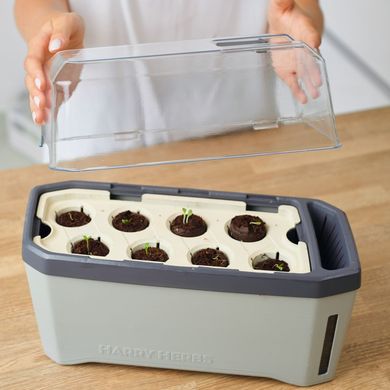 Интелигентната градина за билки с вграден резервоар за вода и капак за отглеждане на билки ще задоволи всичките ви нужди, независимо дали сте решили да отглеждате растения със или без почва, да използвате семена или микрозеленчуци, или дори да изберететипични билки от супермаркета. Най-хубавото е, че Harry Herbs може да се използва на закрито и открито през цялата година. Кажете сбогом на повяхналите растения! Благодарение на резервоара за вода и фитилите за поливане семената, разсадът и растенията ви автоматично ще получат идеалното количество вода. Освен това градината е оборудвана с удобен отвор за пълнене , а благодарение на прозореца можете непосредствено да проверите нивото на водата.