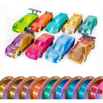 Двуцветна нишка PLA с копринен блясък и променящ се цвят според ъгъла на гледане. Лесна за отпечатване, екологично чиста шпула. 1,75 мм, 1 кг.