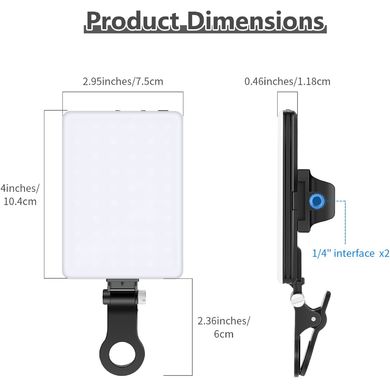 Зарежда се с източник на захранване 5V/1A от мрежово зарядно устройство, захранваща банка или компютър чрез портовете за зарежданеUSB Type-C и micro USB. Предлагат се два метода за монтаж. Кръглата щипка закрепва светлината към вашия смартфон, таблет или лаптоп с дебелина до 0,78"/20 мм и запазва предната камера без препятствия. Монтажът за телефон е подходящ за смартфони сширина 2–3,3" (52–85 мм) и монтира светлината на гърба на телефона за използване като допълнителна светлина. Два отвора за винт 1/4" позволяват директен монтаж на светлината към всяка стойка за светлина.