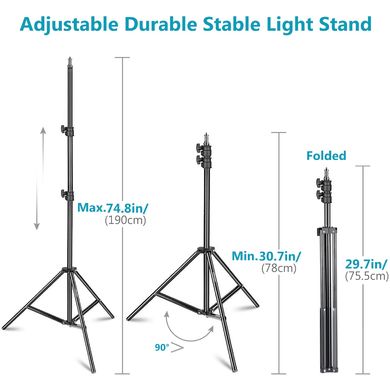 Вграденият LCD дисплей показва големи, лесни за разчитане цифри, за да ви помогне да направите точни настройки. Същите параметри можете да настройвате и с дистанционното управление 2,4 GHz, което има 11 избираеми канала („1–10“ и „88“), позволяващи ви да манипулирате няколко лампи едновременно. Светлинната стойкас трисекционна телескопична централна колона и реверсивни крака на статива позволява широк диапазон на височина от 78 до 190 см. Освен това тя може да бъде компактно сгъната до 75,5 см за безпроблемно съхранение и транспортиране.