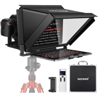 Neewer X12 е устройство за четене с дистанционно управление RT-110, държач за телефон и калъф за пренасяне. Висококачественото стъкло за разделяне на лъча осигурява 75% светлинна пропускливост благодарение на иновативна техника на покритие. Благодарение на регулируемия капак и високотехнологичното стъкло текстът на таблета се отразява ясно на дисплея с висока разделителна способност на устройството за четене. Отразеният текст може да се чете на разстояние до 3 метра.