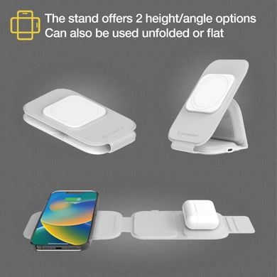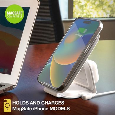 Двойно зарядно устройство 2 в 1 MagSafe, iPhone 7,5 W и AirPods 5 W, Samsung до 10 W (плоско), сгъваема стойка/подложка, регулируем ъгъл, за пътуване, бяло