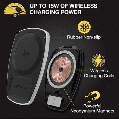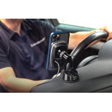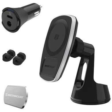 Scosche magnetický držák na telefon s bezdrátovým nabíjením Qi, ideální pro přichycení na rovnou plochu nebo čelní sklo, kompatibilní s MagSafe