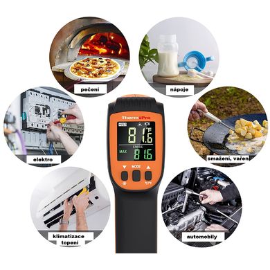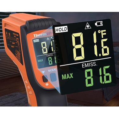 ThermoPro TP450 е електронен безконтактен термометър, който може точно да измерва високите температури на всякакви материали. Колкото по-далеч е устройството от точката на измерване, толкова по-голяма става зоната на измерване. Пистолетният инфрачервен термометър има регулируеми стойности на излъчването, което позволява на детектора за топлинни утечки да измерва по-точно температурите на всеки предмет или материал. Вграденият лазерен показалец осигурява максимална точност при насочване към избраната област