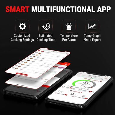 Сондата има два температурни сензора- един за вътрешността на храната (от –10°C до 100°C) и един за камерата за готвене (от –10°C до 300°C). Температурният сензор за вътрешността на сондата осигурява измерена стойност само за3 секунди с отклонение от ±1 °C. Благодарение на степента на водоустойчивост IP67 този кухненски термометър може да се мие под течаща вода или дори в съдомиялна машина. Термометърът се захранва с 2 батерии ААА. Кухненският термометър е лесен за използване с приложението TempSpike. В приложението са налични най-важните видове месо и нива на готвене, които при необходимост могат да се регулират и индивидуално. В приложението можете да настроите алармата предварително, да следите ясно графиката на температурата и хода на готвене на месото, да се свържете директно с отдела за обслужване на клиенти на ThermoPro и да се възползвате от много други функции.