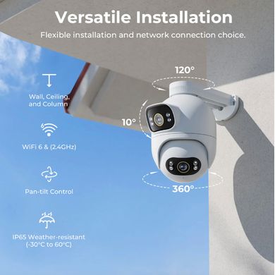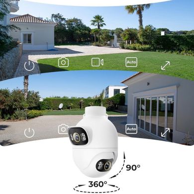 IMILAB EC6 Dual съчетава два 3K обектива в едно тяло. Горният обектив постоянно наблюдава широка статична гледка, докато долният обектив може да се завърта до 360° хоризонтално и 90° вертикално – ръчно чрез приложението или автоматично при засичане на движение. Получавате пълен преглед на входа, двора и входа на къщата без нито едно сляпо петно.