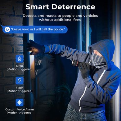 Вграденият AI може да открива хора,автомобили и велосипеди, като елиминира фалшивите аларми, причинени от вятър или животни. В случай на подозрителна дейност камерата може автоматично да задейства сирена, светкавица или собствен гласов запис. Това ѝ позволява да реагира незабавно, дори когато не сте онлайн.