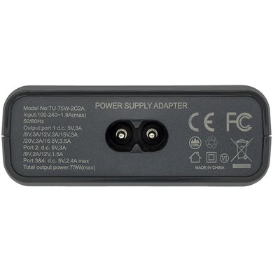 Компактна PD 60W станция за бързо зареждане, която поддържа зареждане на 4 устройства едновременно. 2×USB, 2×USB-C, максимална обща мощност 75W