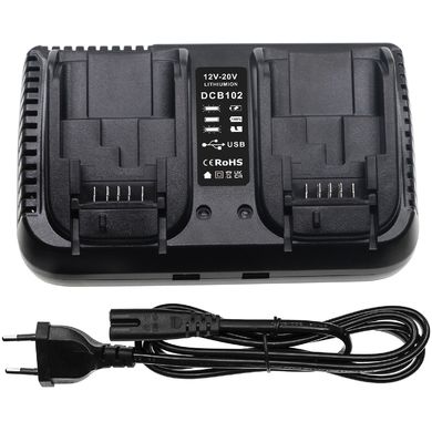 Зарядно устройство за акумулаторни батерии за инструменти DeWalt AC, захранване 220 V, изход 12–20 V, 2 гнезда за акумулаторни батерии, индикация за състоянието на батерията, производител Cameron Sino Technology