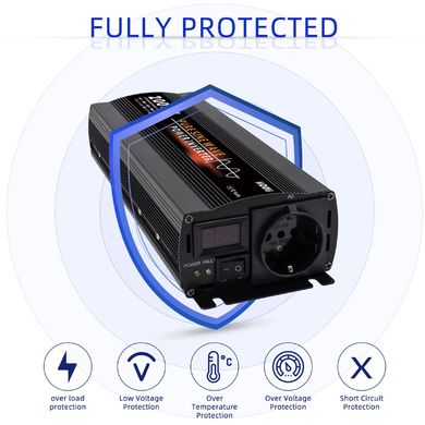 Инвертор от 12V до 230V, изход 1× гнездо 230V, захранване от автомобилен акумулатор, мощност 500W, краткотрайно до 1000W, 1× вентилатор, чиста синусоида, LCD