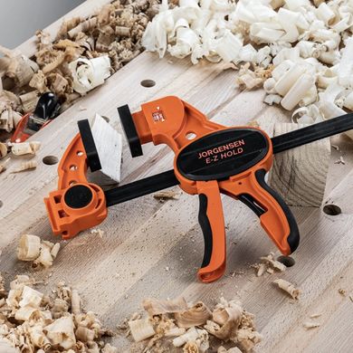За разлика от конвенционалните стяги, E-Z Hold ви позволява да регулирате налягането с помощта на лост, така че можете да настроите силата на стягане според точния вид материал. Независимо дали работите с дърво, пластмаса или други материали, стягата осигурява сигурно и здраво захващане, без да поврежда детайла.