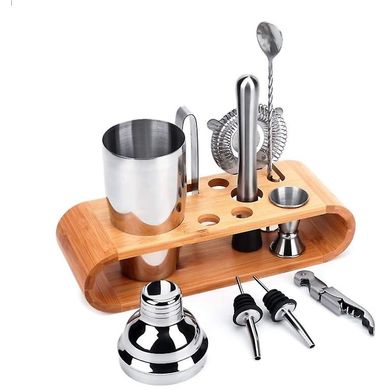 Комплект за бармани 10 части от неръждаема стомана с дървена стойка, шейкър с обем 750 ml, подходящ за начинаещи