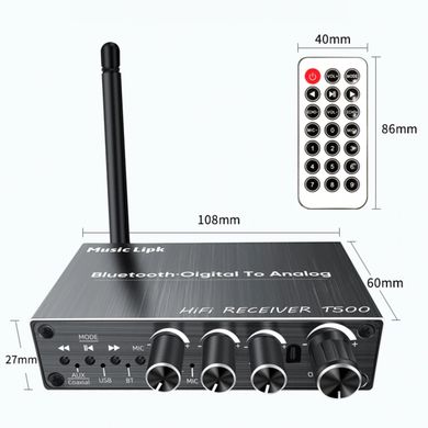 Адаптерът работи като Bluetooth приемник, караоке функция, контрол на ниските и високите честоти, дистанционно управление с обхват до 10 м, сгъваема антена