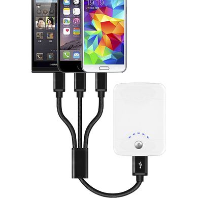 Универсалният кабел с оплетка и конектори MicroUSB, USB-C и lightning може да зарежда до 3 устройства едновременно.