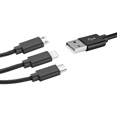 Универсален оплетен кабел с дължина 100 см с конектори MicroUSB, USB-C и Lightning за едновременно зареждане на до 3 устройства.