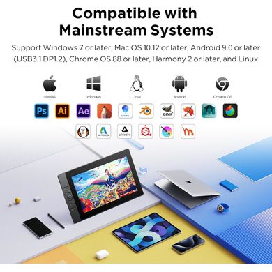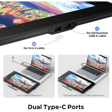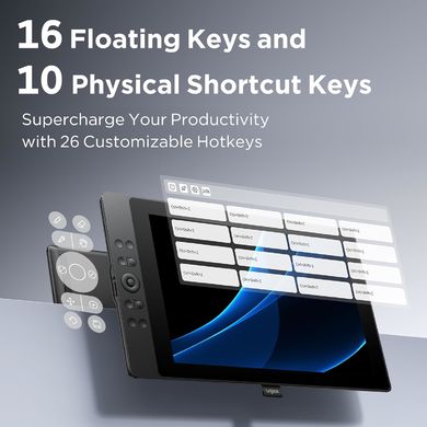 Таблетът Ugee UE16 разполага с колелце за превъртане с уникален дизайн, което улеснява прецизното регулиране на инструментите за рисуване, като същевременно се превърта лесно по време на работа. Той разполага и с 8+1 чувствителни на допир клавиши за бърз достъп, които подобряват потребителското изживяване и позволяват плавно преминаване между инструментите и режимите. Освен това чрез задържане на бутона за захранване за три секунди потребителите могат да активират режима за рисуване на таблета, който подобрява съвместимостта с различни приложения за рисуване и оптимизира работния процес за художниците. Този таблет може да бъде свързан със смартфони, компютри или лаптопи, което го прави отличен избор за водене на бележки. С широк набор от функции таблетът Ugee UE16 позволява на потребителите да изпълняват творчески задачи на различни устройства, независимо от ситуацията. Той служи като многофункционален инструмент, който ефективно подпомага широк спектър от творчески дейности- от създаване на произведения на изкуството до редактиране на документи и мултимедия.