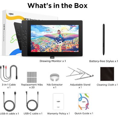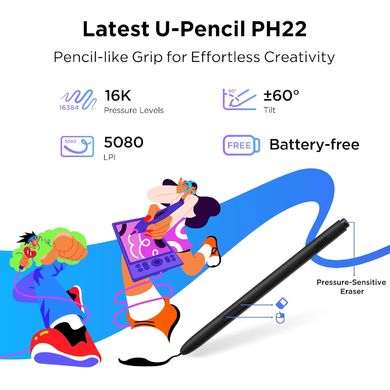 FHD (1920×1080) резолюцията значително подобрява яснотата на детайлните илюстрации. В резултат на това всеки аспект – от фините линии до смелите сенки – се изобразява с прецизност. В резултат на това този таблет еотличен избор за илюстратори, графични дизайнери и всички, които ценят отчетливите и ярки изображения. Ugee UE16 разполага с новия стилус EMR, проектиран с тънък и ергономичен профил за плавно и удобно рисуване. Той се отличава с 16 000 нива на чувствителност към натиск, разпознаване на 60° наклон и ви позволява да създавате сложни щрихи с различна интензивност, имитирайки автентичното усещане за рисуване с традиционен молив. Освен това вграденият в стилуса бутон за бърз достъп улеснява преминаването между функциите на писалката, гумата и мишката, което го прави удобен инструмент дори за начинаещи художници.